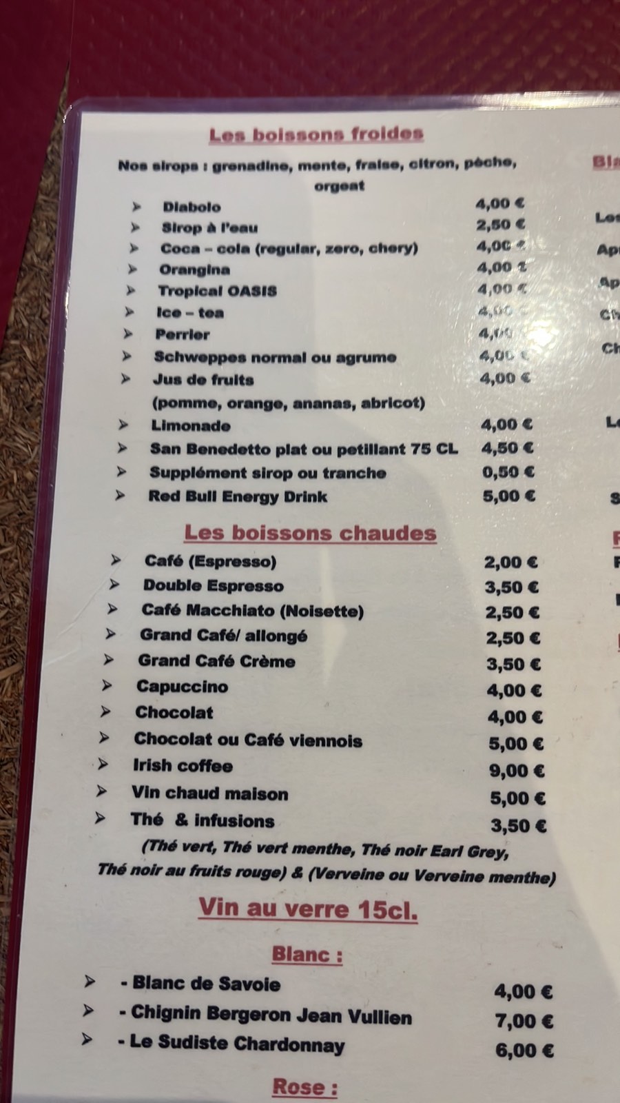 Ljubitelji kuvanog vina moraće da izdvoje na stazi 5,00 €, dok je čaj 3,50 €. Belo vino iz Savoje na čašu treba platiti 4,00 € Chignin Bergeron Jean Vullien - 7,00 € Le Sudiste Chardonnay - 6,00 €.